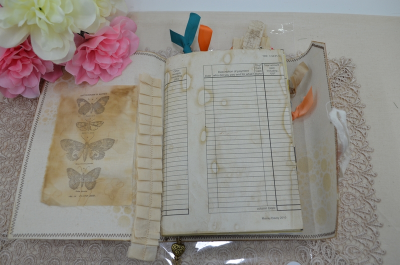 I have included a few tags to each journal, they are made from the off cuts of the covers. Each journal varies a little, some will have a book mark and some a belly band. I have also included a scrap of fabric with a stamped image, and a small length of pleated ruffle to show you what you can do with bits and pieces.