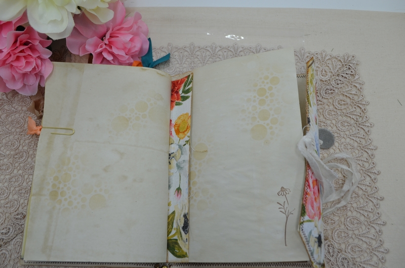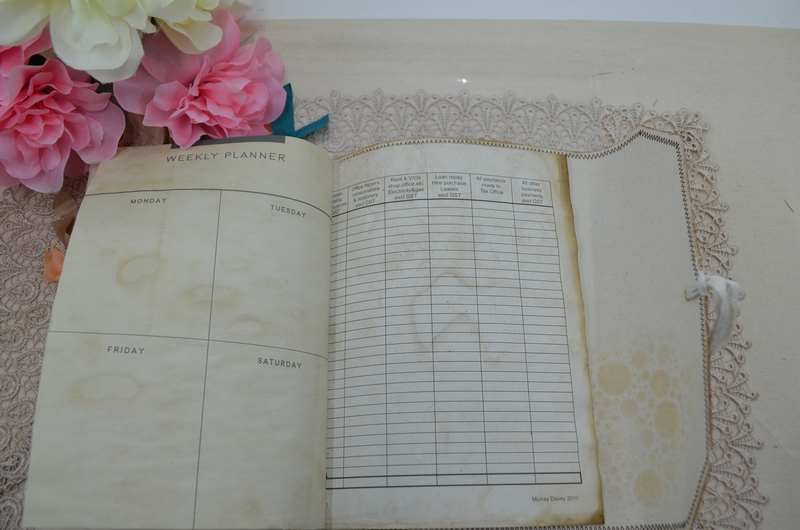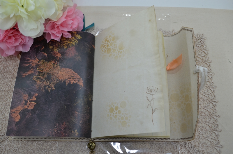 The plain tea stained papers have been stencilled and have a small stamped image randomly, throughout the journal. I have done this to every journal I have made as it breaks the blank page. Quite often it’s hard to stare at a blank page and know how to start, none of the pages are blank and ready for you to jump in and enjoy.