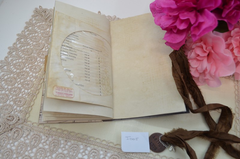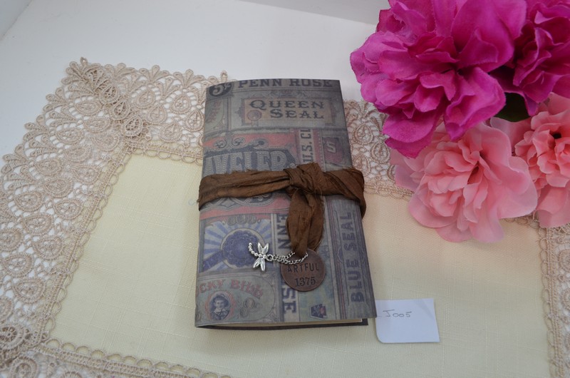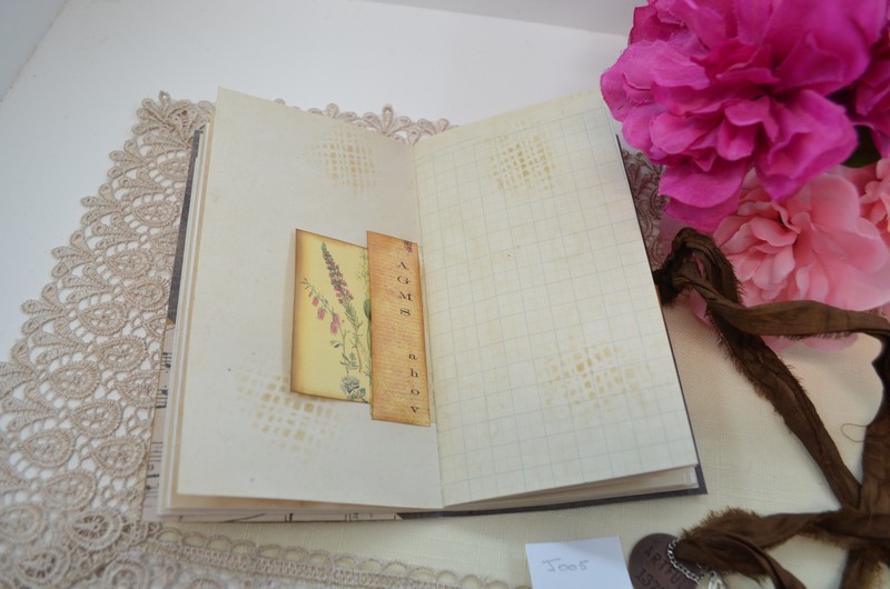 This notebook has a variety of pages made up of tea dyed paper and scrapbook papers. There are several tucks and pockets with tags and cards which can be removed to allow your personal notes, receipts etc to be placed in them.