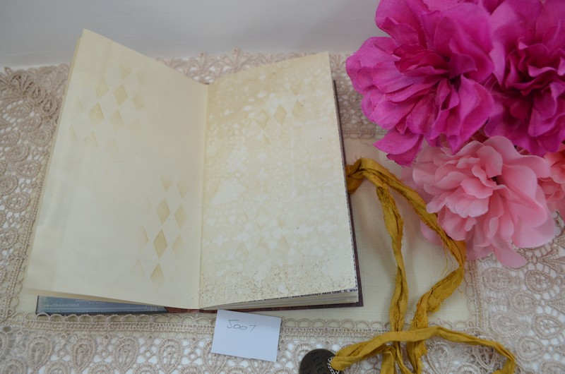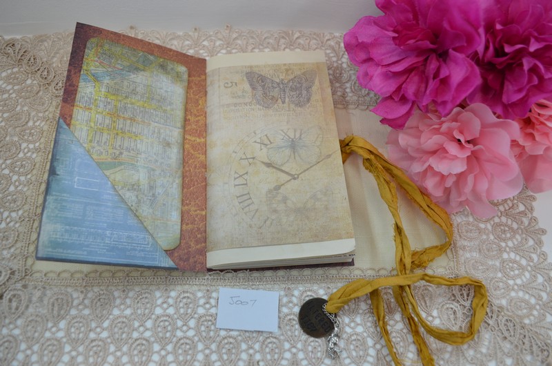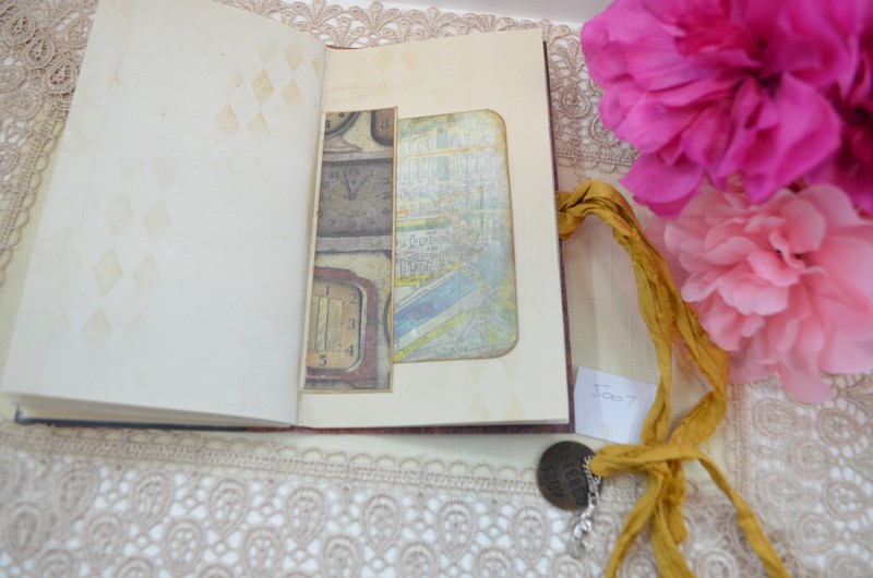 This notebook has a variety of pages made up of tea dyed paper and scrapbook papers. There are several tucks and pockets with tags and cards which can be removed to allow your personal notes, receipts etc to be placed in them.