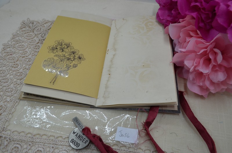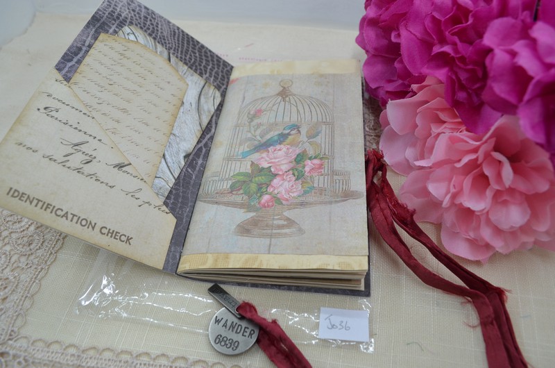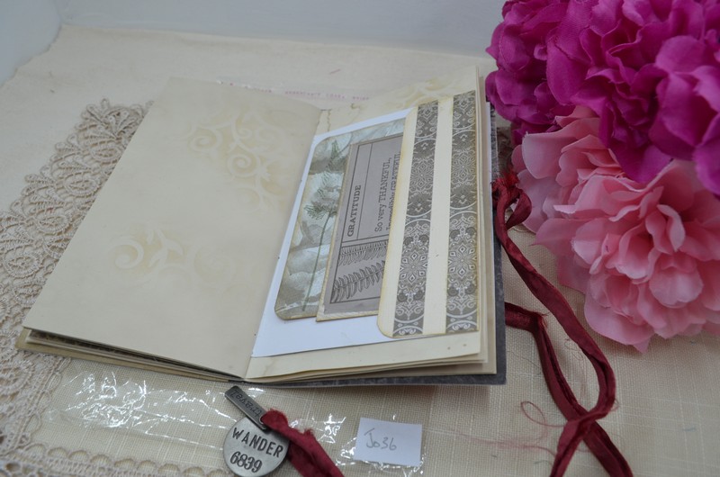 This notebook has a variety of pages made up of tea dyed paper and scrapbook papers. There are several tucks and pockets with tags and cards which can be removed to allow your personal notes, receipts etc to be placed in them.