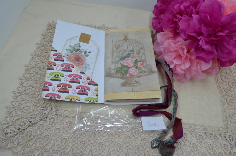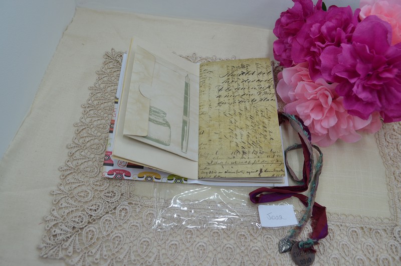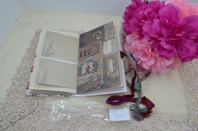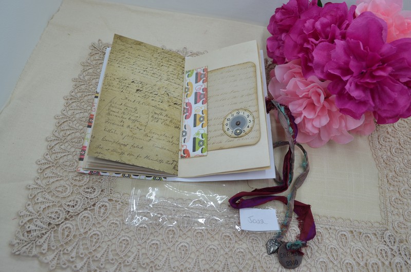 This notebook has a variety of pages made up of tea dyed paper and scrapbook papers. There are several tucks and pockets with tags and cards which can be removed to allow your personal notes, receipts etc to be placed in them.