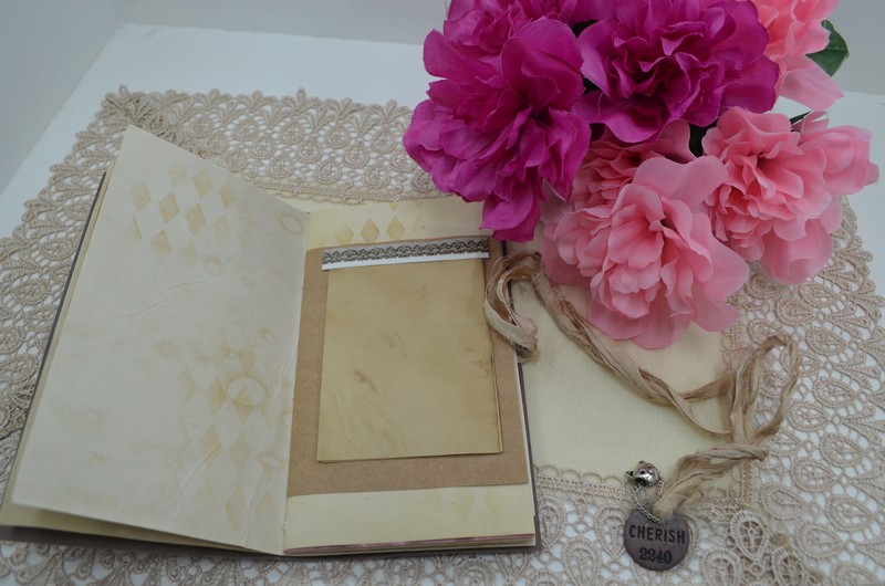 This notebook has a variety of pages made up of tea dyed paper and scrapbook papers. There are several tucks and pockets with tags and cards which can be removed to allow your personal notes, receipts etc to be placed in them.