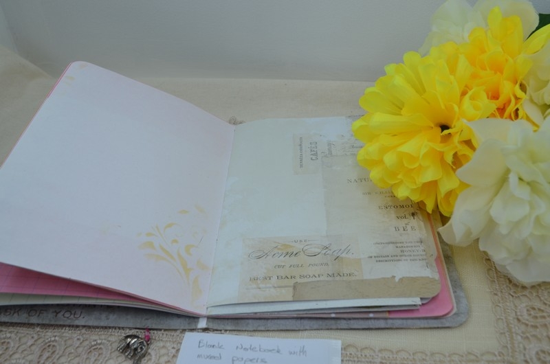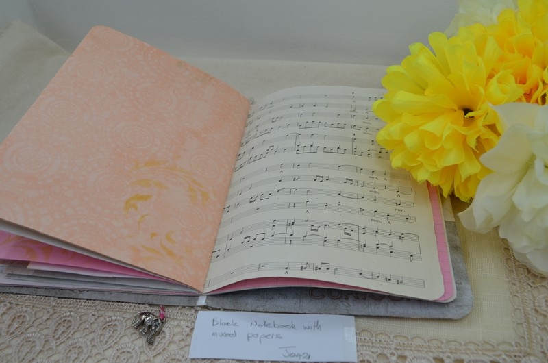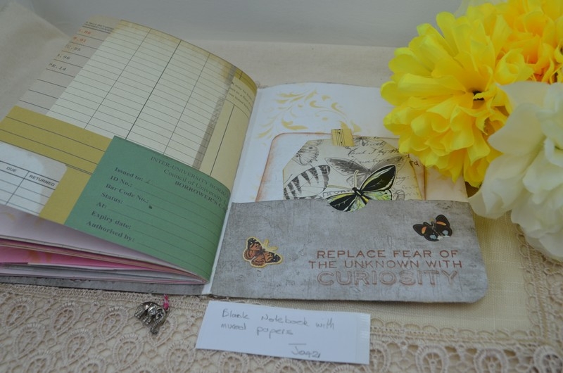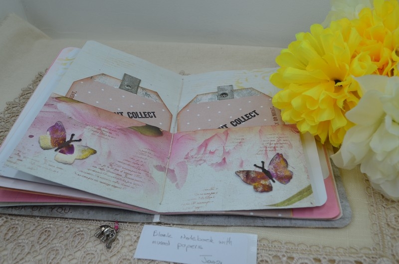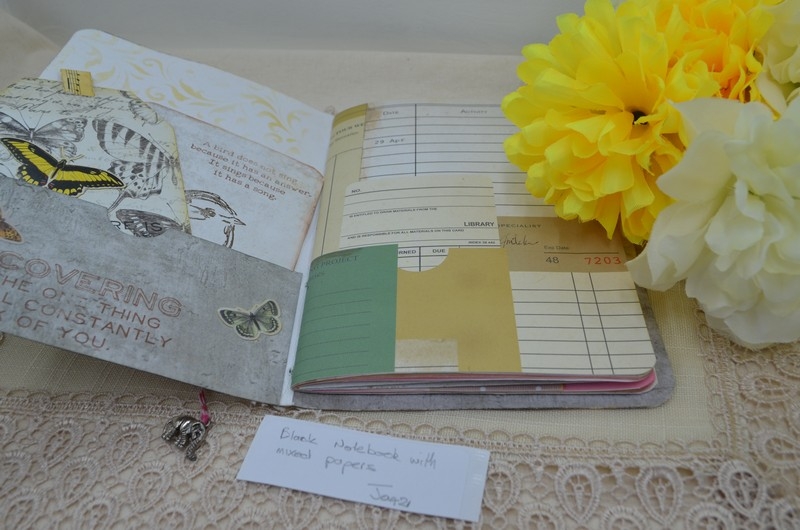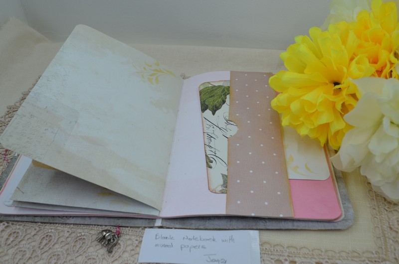 My notebooks all vary a little but are made using the same formula. The notebooks are 7×5 card stock and are covered with scrapbook paper, the front and back inside covers have pockets with tags, a large card or mini notepads. The centre has an envelope for those important bits of information or receipts.
