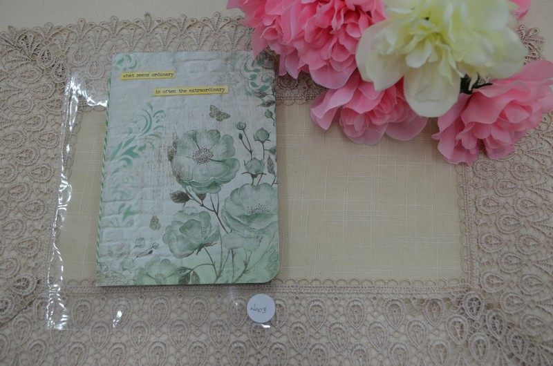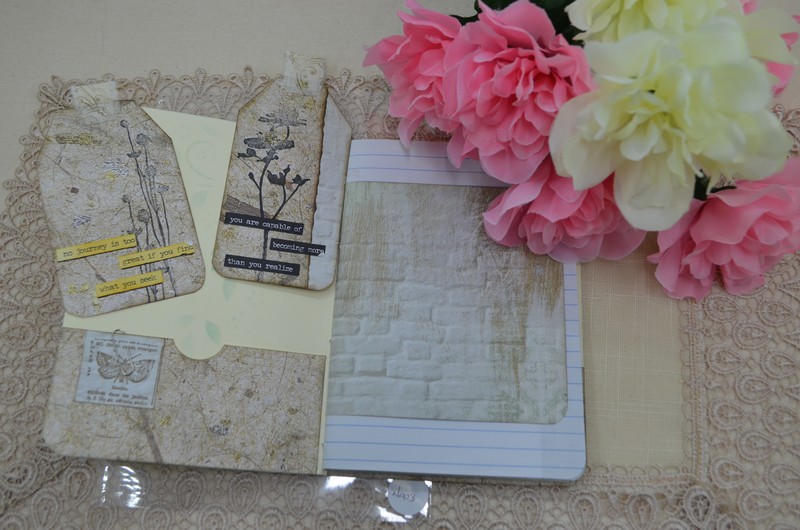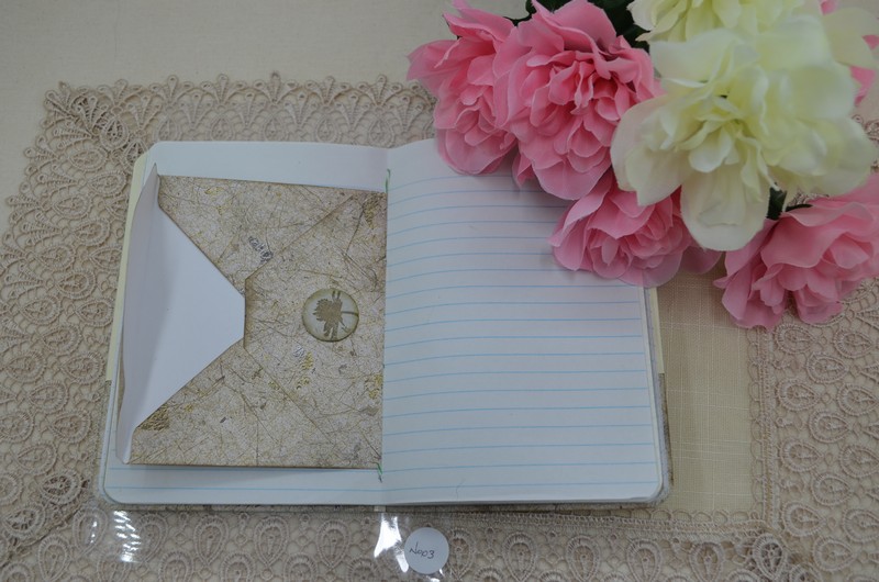My notebooks all vary a little but are made using the same formula. The notebooks are 7×5 card stock and are covered with scrapbook paper, the front and back inside covers have pockets with tags, a large card or mini notepads. The centre has an envelope for those important bits of information or receipts.