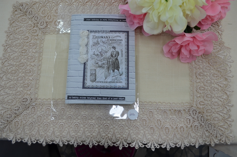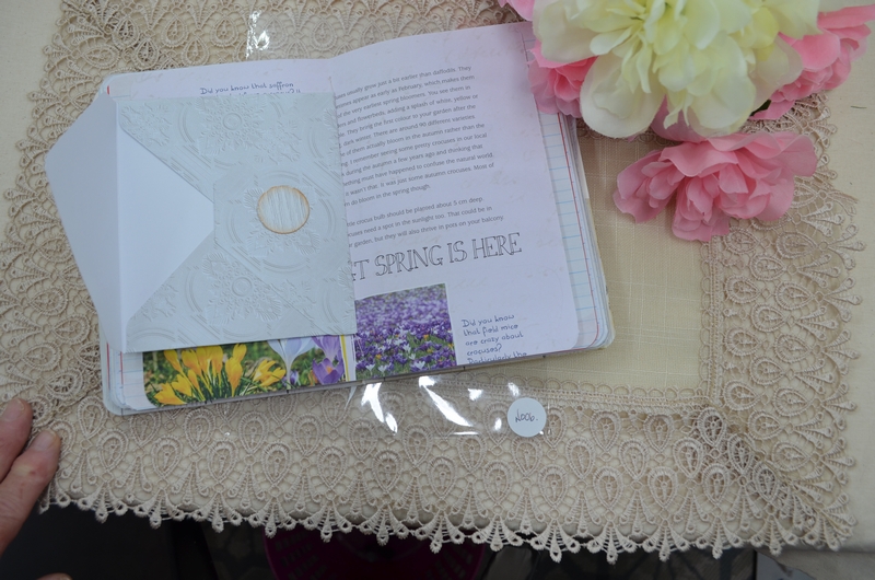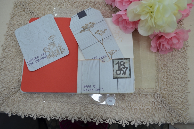 My notebooks all vary a little but are made using the same formula. The notebooks are 7×5 card stock and are covered with scrapbook paper, the front and back inside covers have pockets with tags, a large card or mini notepads. The centre has an envelope for those important bits of information or receipts.