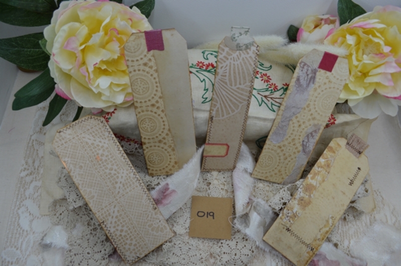 Thin tall, collaged tags stamped and has a focal point.? Each pack has the same number of tags, but every tag is different.